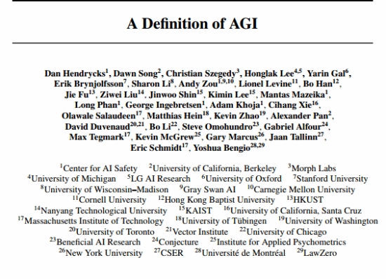 所以最近,一群顶尖的行业大佬实在看不下去了,几十位专家联手发表了一篇论文,作者阵容堪称全明星级别,其中包括图灵奖得主、谷歌前CEO等重量级人物。他们共同协作,提出了迄今为止首个关于AGI的量化定义。