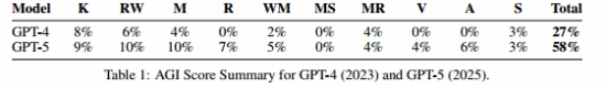他们也顺便用GPT模型做了个测试,结果显示,如果AGI是100分,GPT-5只有58分,不及格的水平。