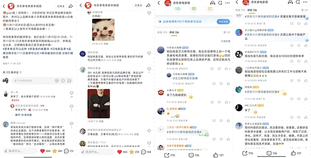 在社交传播层面,京东家电家居在微博、小红书等平台发起#假如我是xx品牌总裁#、#京东11.11乘风破浪的总裁#等话题互动,成功激活用户的共创热情。相关话题总阅读量达3.9亿,讨论量6万,吸引超30位百万至千万量级KOL参与内容共创,总互动量近430万。