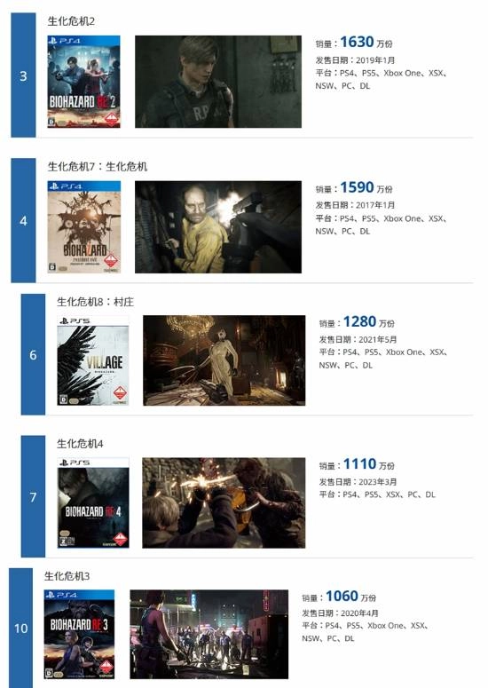 在“白金游戏列表”的前10名里,除了《怪猎》系列,其余位置差不多都被《生化危机》系列占据了。具体来看,《生化危机2:重制版》排在第3位,销量达1630万份;《生化危机7》位列第4,销量1590万份;《生化危机8》处于第6名,销量1280万份;《生化危机4:重制版》排在第7,销量1110万份;《生化危机3:重制版》则位居第10,销量为1060万份。
