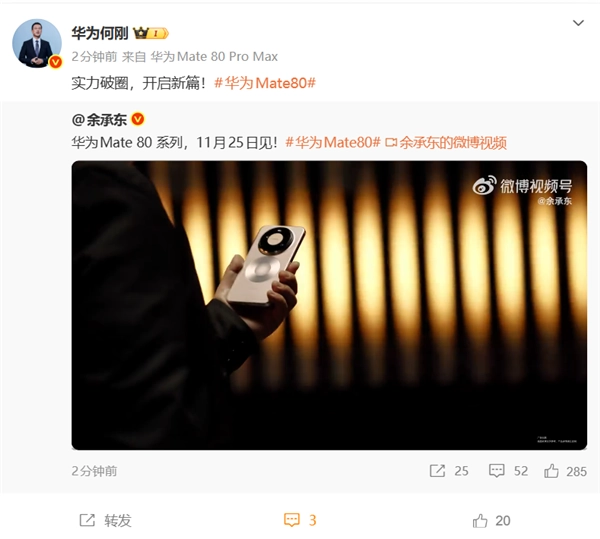 今天早上,华为官方率先公布了一则消息:华为Mate 80系列、Mate X7以及全场景新品的发布会,已经确定在11月25日举办。紧接着,余承东发布了一条预热视频,这是首次对外展示该系列手机的真机外观,值得注意的是,他这条微博的小尾巴显示的是“华为Mate 80 Pro Max”。