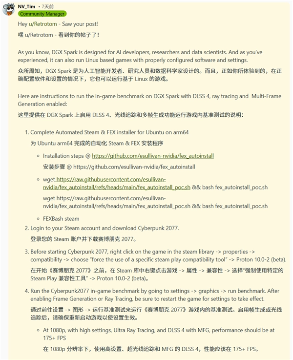 社区对DGX Spark游戏性能表现出的兴趣受到了关注,NVIDIA为此后续推出了一份简要指南以优化该游戏的运行效果,其中关键在于开启DLSS与多帧生成技术。