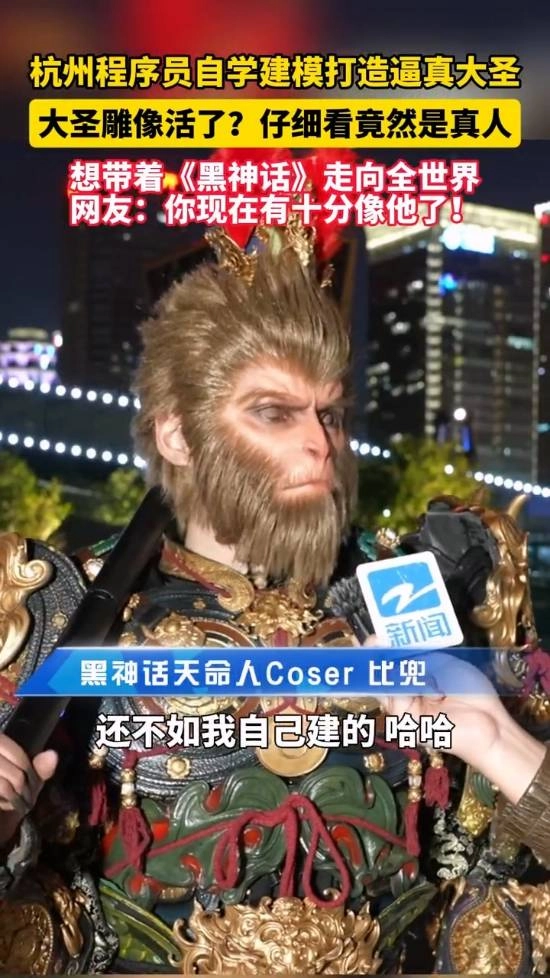 这套逼真装备的打造者是杭州的一位程序员小伙。2024年11月,他决心要COS大圣,不惜花费重金让大圣雕像“活过来”,纯粹是出于个人喜好。一年时间里,装备里最关键的头套已经更换过好几个版本,经过持续的升级优化,才呈现出如今的效果。