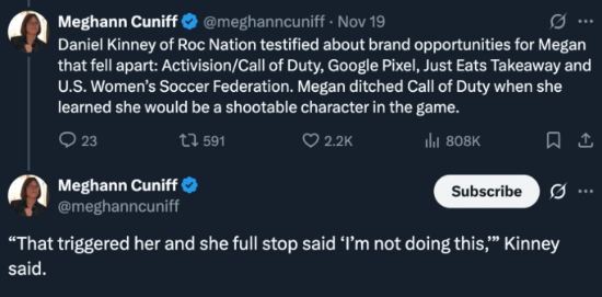 11月19日,某诽谤案庭审过程中,呈堂证据提到了Megan曾有过的多个未能落实的合作项目,这其中就包含了此次和《使命召唤》的联动事宜。