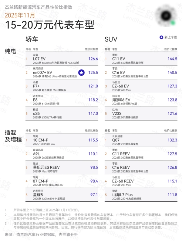 1在15万至20万元的价格区间内,零跑C11 EV以144.5的高分在SUV纯电车型榜单中占据领先地位,充分体现了其在配置上的诚意与出色的价格把控能力。而在轿车领域,深蓝L07 EV和en007+ EV等车型也依靠智能化配置与合理定价取得了不错的成绩。