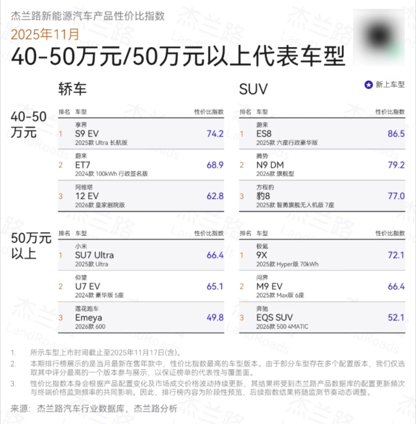 11月28日,杰兰路咨询推出了2025年11月新能源汽车产品性价比指数排行榜,涵盖5万元到50万元以上的多个主流价格段。在各细分市场的白热化竞争里,享界S9系列的表现格外突出,其中S9T在30万-40万元纯电轿车细分市场、S9在40万-50万元及以上纯电轿车细分市场这两大高端领域中均位居第一。