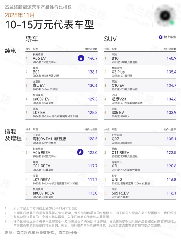 在中端及大众市场,10万-15万元与15万-20万元这两大价格区间,已成为自主品牌竞争的核心战场。具体来看,10万-15万元的轿车领域里,长安启源A06 EV和零跑B01表现突出,分别以140.7分与138.1分的优异成绩处于领先位置;而在同价位的SUV车型中,零跑B10凭借140.9的指数,成为该价位段性价比最为出色的车型。