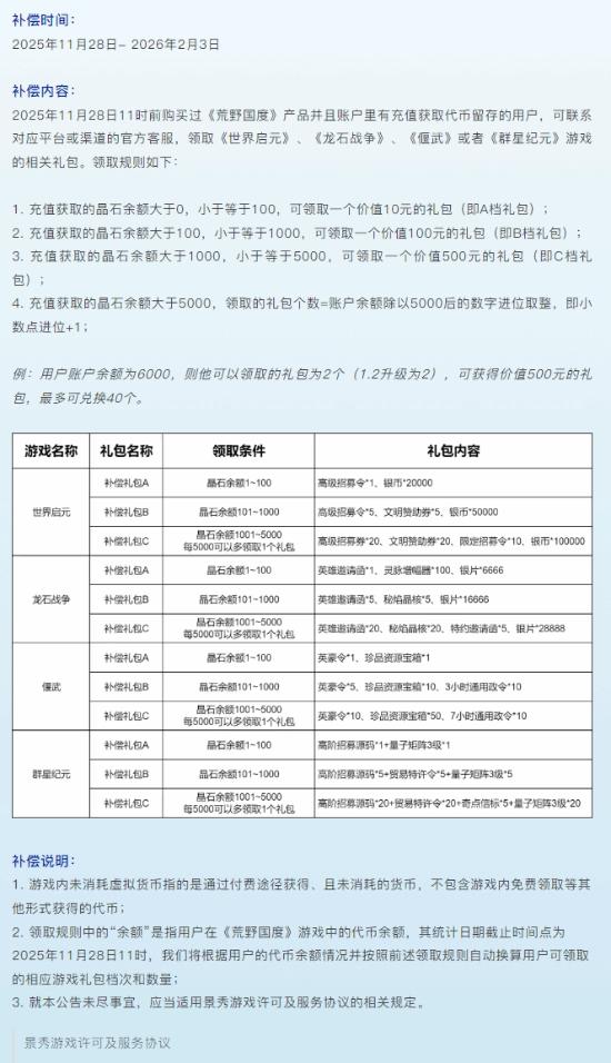 感谢所有一直以来支持《荒野国度》的玩家朋友们!从停运公告发布的那一刻起,直到2026年1月27日上午11点,大家游戏账号里还没花完的货币都能正常使用。另外,我们会通过游戏内邮件给每位玩家额外发放10000流晶作为补偿,希望大家能继续在游戏里度过一段愉快的时光。