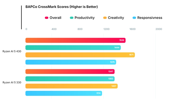 在BAPCo CrossMark性能测试里,AMD锐龙AI 5 430的综合得分是1526,相比它的上一代产品提升了大约19%,这表明该处理器或许具备更高的运行频率或者更优的架构设计。