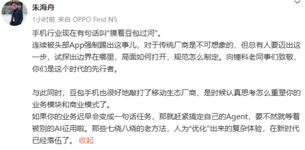 12月5日,OPPO的软件产品经理朱海舟发布内容表示,当前手机行业流传着“摸着豆包过河”这样一句话。