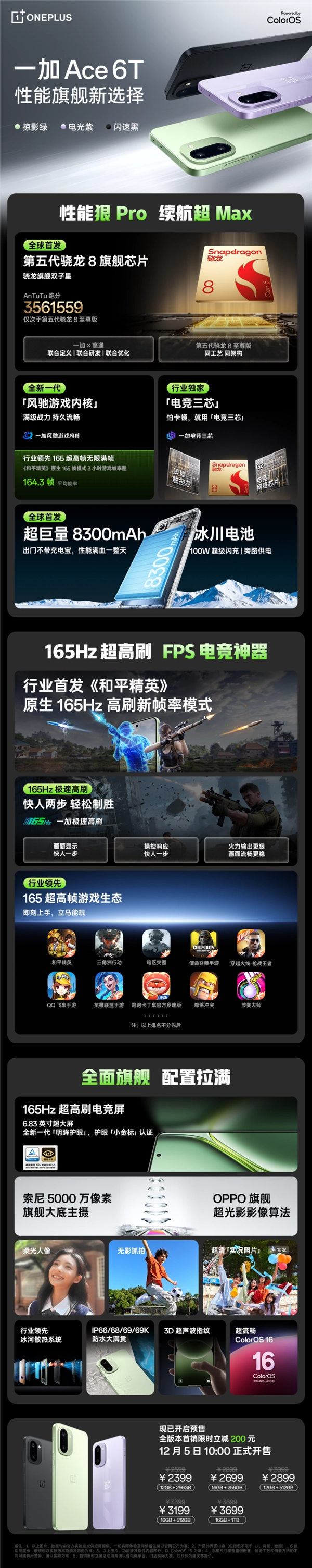 12月5日消息,一加Ace 6T于今日开启正式首销,全版本在首销期间享有限时优惠,可立减200元,最终到手价从2399元起。
