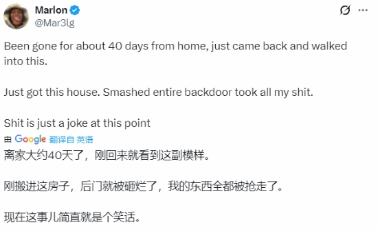 Marlon在社交平台发文感慨:“这是我这辈子最难熬的一个月,没想到回家后竟发现房子遭人破坏、财物被盗。我搬来才几个月,平时很少在家,却有人强行闯入,砸坏了后门和窗户,衣服被扔得到处都是。”他接着说道:“我刚下飞机就得知了这个消息。我的PS5被偷走了,不少物品都不见了,整个屋子乱糟糟的。”