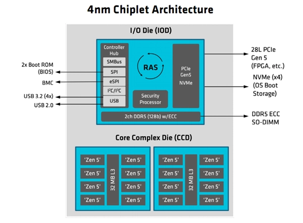 12月11日消息,AMD已正式推出新一代“EPYC嵌入式2005”系列处理器,该系列采用与移动端锐龙9000HX系列(Fire Range)相同的4nm工艺及CCD+IOD Chiplets架构,并针对嵌入式市场进行了专项优化。