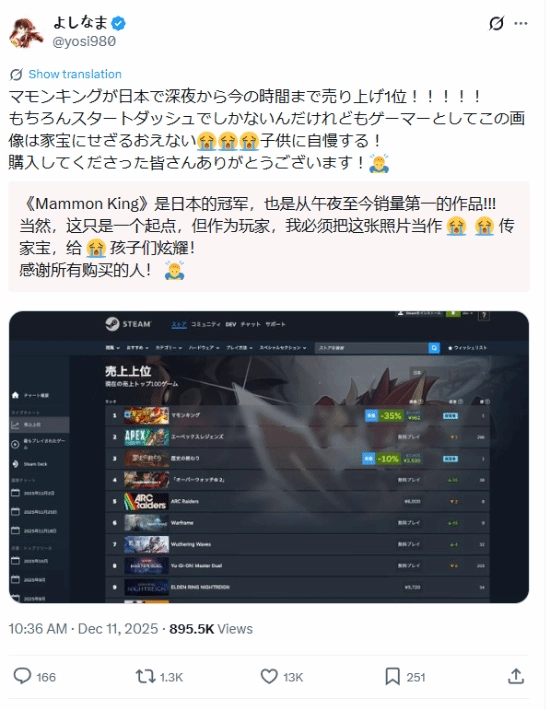 据外媒Game Spark消息,近日,由日本知名游戏实况主Yoshinama(よしなま)担任制作人的怪兽养成模拟游戏《Mammon King(玛蒙之王)》于12月10日正式推出,且在发售数小时后便登上Steam日区热销榜榜首。