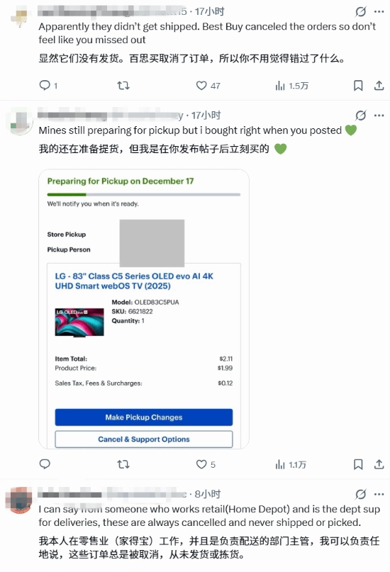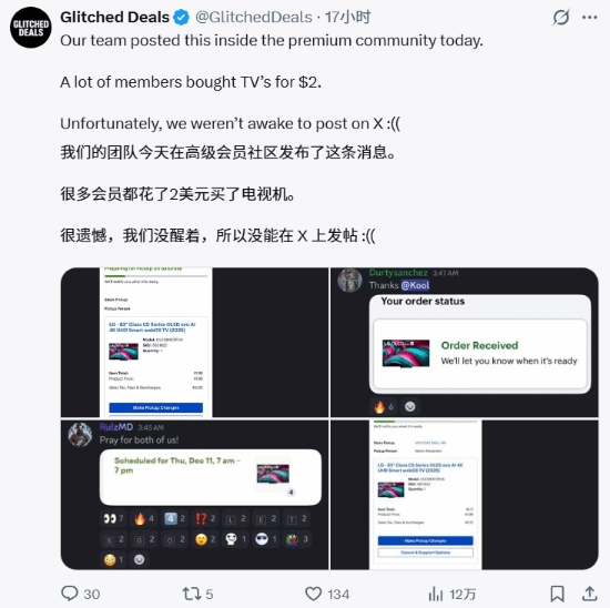 @GlitchedDeals表示其团队在凌晨发现了这个堪称“终极白嫖”的机会,并将消息发布到会员社区,不少用户仅花2美元就抢到了电视。