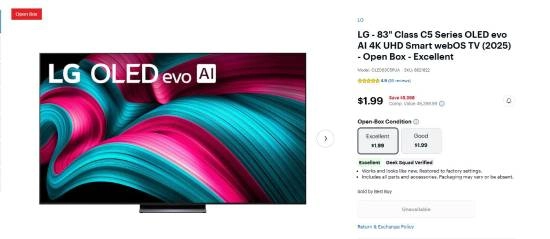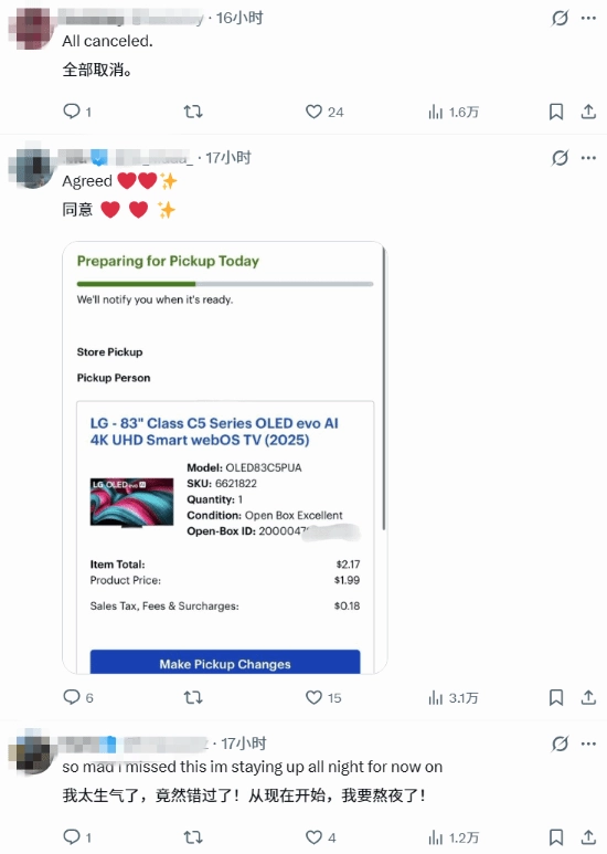 今日,推主@GlitchedDeals分享了国外电商平台上堪称离谱的“临时工”操作——原本售价5400美元的83英寸LG电视,标价竟低至2美元。