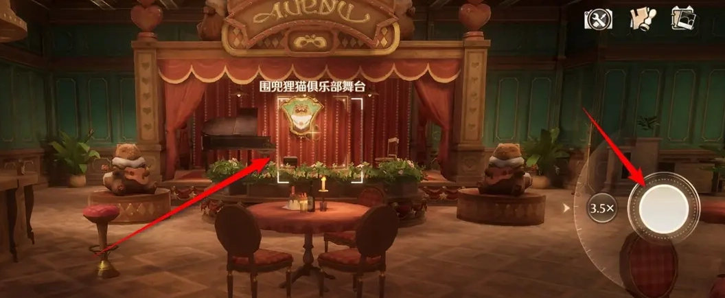 3、把相机对准舞台,当识别出“围兜狸猫俱乐部舞台”时,按下相机快门进行拍照。