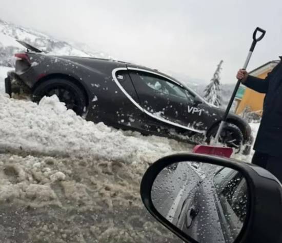 现场照片呈现出这样一幕:一辆黑色的Tourbillon原型车停在克罗地亚的路边,车身被厚厚的积雪与泥浆所环绕,有人员正拿着铲子清理车辆周边的积雪。这一情景起初让人们猜测,车辆可能是失控滑出了道路,或是陷入了雪坑之中。