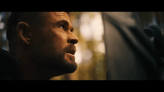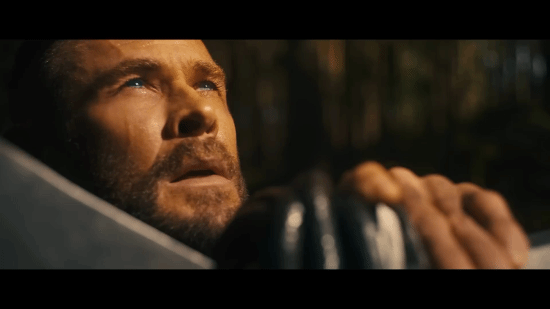 索尔和他在《雷神4》里收养的女儿Love(依旧由海姆斯沃斯的女儿India Rose出演)待在一块儿。索尔流着泪向父亲奥丁祷告,盼着能在战斗中最后一次战胜敌人,活着归来,和女儿相聚。