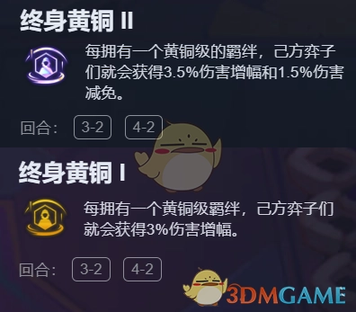 【终身黄铜 II】每当己方拥有一个黄铜级羁绊,己方弈子门便能获取3.5%的伤害增幅以及1.5%的伤害减免。