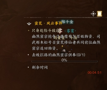 任务详情:幽煞密宗劫掠了康赞布龙百姓的物资,司武那木松呼吁蛮荒之地的修仙者一同前往幽煞密宗,把物资追讨回来。