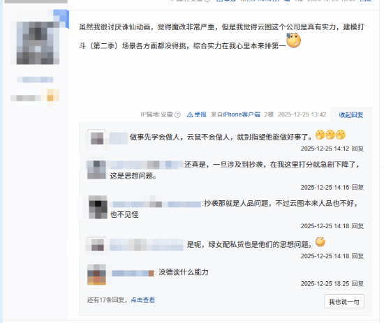 部分网友认可云图公司的制作硬实力,觉得其“建模、打斗、场景都无可挑剔,综合实力原本能排第一”,然而“抄袭”成了致命的减分项。有网友把抄袭归结为“人品问题”,坦言“做事先做人,云图连人都不会做,别指望能做好事”;就算有用户猜测“或许是底层员工图省事、审核不严格”,也难以扭转舆论对制作方的负面评价,有评论直接指出“没有品德谈什么能力”。