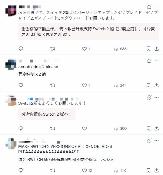对此,粉丝们纷纷下场催更,“明年发力时务必把异度神剑的前作都升级适配NS2啊”“别搞升级了,我要异度神剑4”之类的呼声此起彼伏,相比之下,向官方表达感谢的反而成了少数,不过这样的状况倒也更能体现粉丝的热情不是吗?